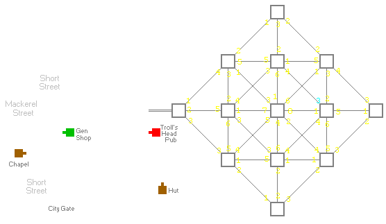 You can all worship Cloister for this map, as it's copied from the one he mailed me! Just as well too: My own failed attempt to figure out how the exits joined together ended up looking like a paint-by-numbers picture of spaghetti :)